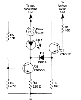 Encontrado nua Radio Experimenter Handbook numa edição de 1986, este circuito avisa quando os faróis altos do carro estão ligados e ele é desligado. O circuito usa componentes comuns.