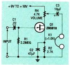 Este amplificador para fone de ouvido tem bom ganho e alta impedância de entrada. O circuito é de uma Electronics Now devendo ser usado com fone de alta impedância.