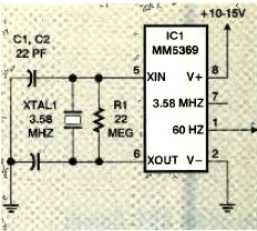 Encontrado na revista Electronics Now de janeiro de 1998, este circuito usa um cristal de TV no padrão americano. O circuito deve ser alimentado com as tensões indicadas.