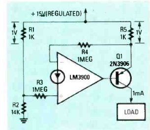 Esta fonte de corrente fixa utiliza um amplificador de Norton LM3900. A corrente máxima depende do transistor utilizado. Neste caso está fixa em 1 mA.