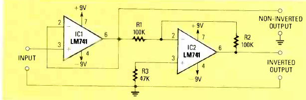 Este circuito obtém sinais com fases invertidas a partir de um sinal único. O circuito utiliza dois circuitos integrados LM741 e exige fonte de alimentação simétrica.