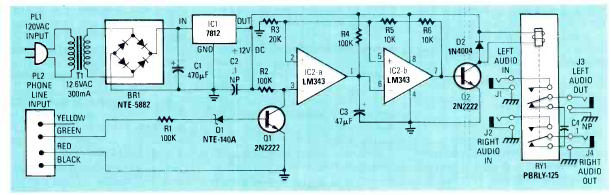 Este circuito desativa o som de um sistema ao receber uma chamada telefônica. O circuito é de uma Radio Electronics de dezembro de 1990.