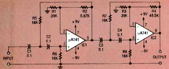 Este filtro para 100 Hz foi encontrado na revista Electronics Now de agosto de 1993. Os componentes podem ser alterados para operação em outras frequências.