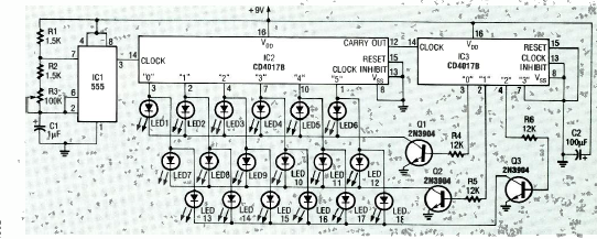 Este interessante circuito de 18 LEDs multiplexados foi encontrado na revista Radio Electronics de fevereiro de 1992. O circuito tem sua velocidade controlada em R3. Os LEDs formam barras móveis de 6 LEDs.
