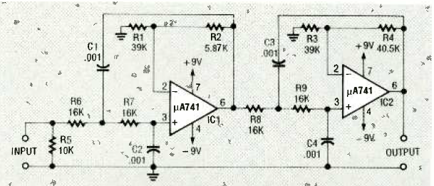 Usando dois amplificadores operacionais 741 este circuito passa baixas tem como frequência de corte 10 kHz. Encontramos num artigo da revista Electronics Now de agosto de 1993.