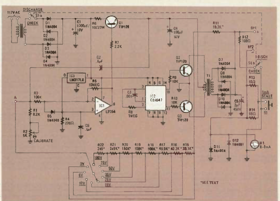 Este circuito é de uma revista Radio Electronics de maio de 1986. Obseve as tensões aplicadas aos capacitores, tomando cuidado para que o capacitor em teste as suporte.