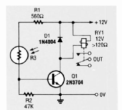 Este circuito simples com LDR foi encontrado na revista Radio Electronics de julho de 1992. Qualquer transistor de uso gera pode ser utilizado. A alimentação é de acordo com o relé.
