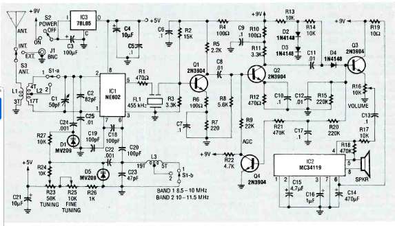 Este receptor cuja faixa de sintonia depende de L1 e L2 foi encontrado na edição especial de 1992 do Radio Electronics Experimenter. O circuito é relativamente simples e tem boa sensibilidade.