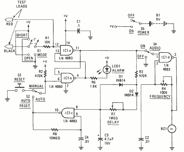 Este provador de continuidade com o 4093 foi encontrado na revista Radio Electronics de novembro de 1986. O circuito alimenta um buzzer cerâmico com um ajuste de frequência.