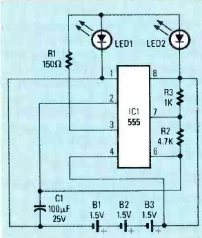 Este circuito ara um robô decorativo foi encontrado na revista Radio Electronics de abril de 1988. A frequência das piscadas e dada por C1 e sua intensidade por R1.