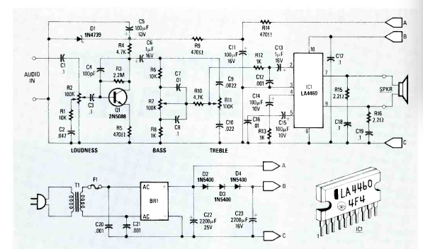 Este circuito pode ser usado como caixa amplificada para instrumentos musicais ou mesmo com o seu celular. O circuito é antigo tendo sido encontrado na edição de 1990 da revista Radio Electronics Experimenter.