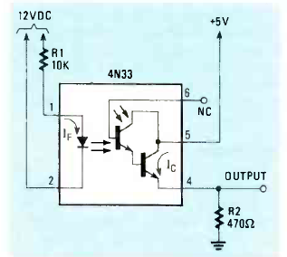 Na figura temos o modo de se usar um sinal de 12 V para disparar uma porta TTL por meio de um acoplador óptico. O circuito é de uma Radio Electronics de maio de 1985.