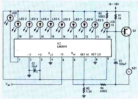 Na figura temos o modo de se implementar um buzzer de alarme num LM3914 para avisas sobre a passagem do limite de escala. O circuito pode usar outros tipos de aviso.