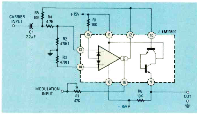 Este circuito é um multiplicador de quatro quadrantes usando um LM3900. O circuito foi encontrado na revista Radio Electronics de julho de 1988.