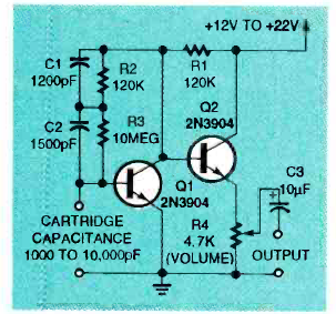 Este circuito para cápsulas cerâmicas foi encontrado na revista Electronics Now de março de 1993. Q1 pode ser de baixo ruído. O outo transistor é de uso geral.