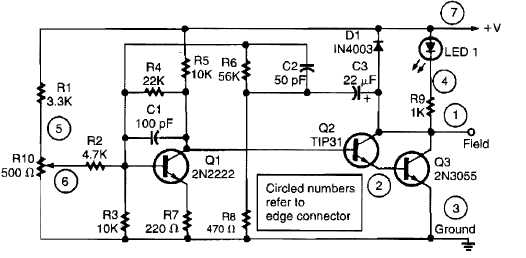 Encontrado numa Radio Electronics dos anos 90, este circuito é para carros da época. O circuito usa um 2N3055 que deve ser dotado de dissipador de calor.