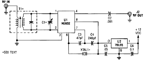 Encontramos este circuito puma Popular Electronics dos anos 90. O transformador T1 determina a faixa de frequências recebida e o cristal a frequência em que o sinal convertido será recebido.