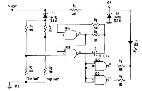 Baseado em portas lógicas CMOS, este circuito foi encontrado numa Electronic Design dos anos 90. O circuito é para tensões de 11 a 15 V, mas pode ser alterado,