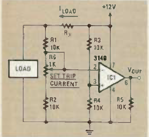 Este circuito dispara quando a corrente numa carga supera o valor programado que depende de Rx. O circuito é da revista Radio Electronics de junho de 1986.