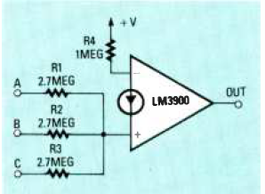Na figura temos o modo de se implementar a função AND com um amplificador operacional de Norton LM3900. O número de entradas pode ser alterado.