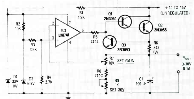 Esta fonte foi encontrada na revista Radio Electronics de setembro de 1989. O 2N3055 deve ser dotado de radiador de calor.