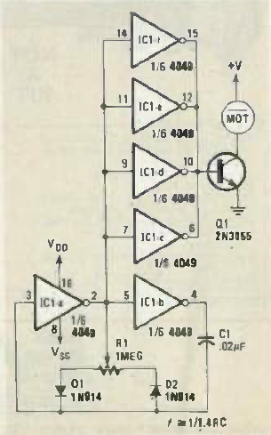Usando o CMOS 4046 este controle de motor foi encontrado na revista Radio Electronics de novembro de 1984. A corrente máxima do motor depende do transistor, podendo chegar a mais de 3 A como neste caso.