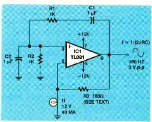 Este oscilador para sinais senoidais uma lâmpada como elemento estabilizador. Encontramos na revista Electronics Now de março de 1997. A configuração se aplica a outros operacionais.