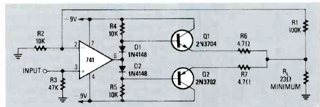 Este amplificador de áudio com transistores de uso geral na saída foi encontrado na revista Radio Electronics de março de 1990. A fonte de alimentação deve ser simétrica.