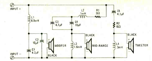 Este divisor de frequência para caixas com 3 alto-falantes foi encontrado na revista Radio Electronics de dezembro de 1978. Os valores das indutâncias devem prever componentes com capacidades de corrente de acordo com a potência do amplificador.
