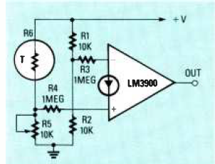 Na figura temos o modo de se implementar um sensor de sobretemperatura com o amplificador de Norton LM3900. O sensor é um termistor e R5 tem valor de acordo com este componente.