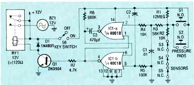 Este circuito foi encontrado na revista Radio Electronics de maio de 1990. Os tempos dependem dos capacitores e a tensão de alimentação depende do relé utilizado.