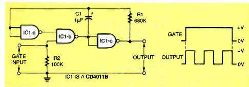 Utilizando 3 portas este oscilador retangular foi encontrado na revista Electronics Now de março de 1996. A frequência máxima é de alguns megahertz determinada por R1 e C1.