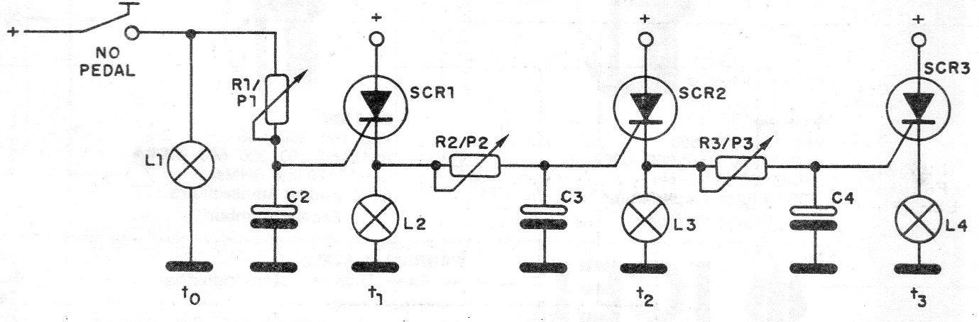 Com o disparo do SCR2 acende a lâmpada L3 e ao mesmo tempo entra em ação o terceiro circuito de tempo que é formado por R3, P3 e C4.