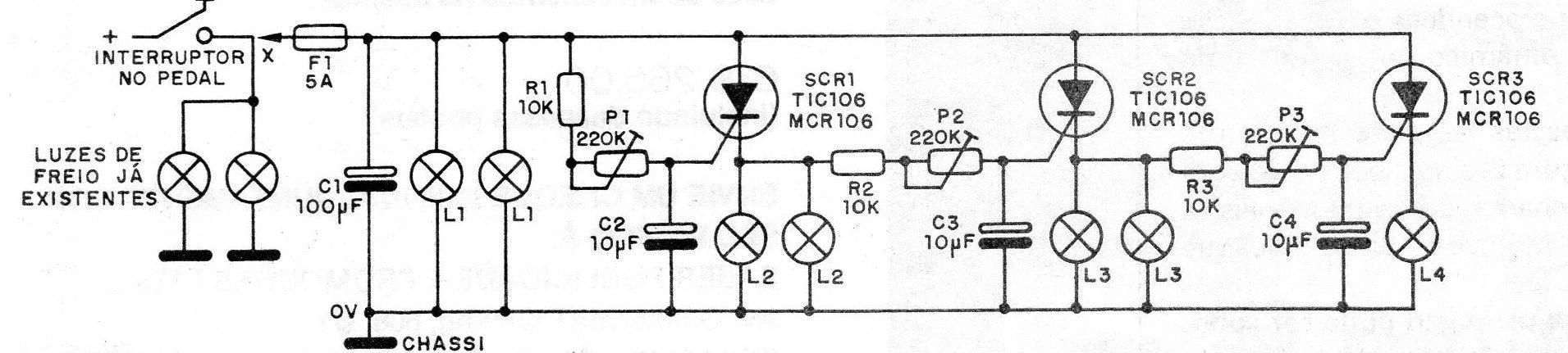 Obs. O artigo é de 1986 quando a Brake Light era novidade. O projeto usado usa lâmpadas, mas podemos facilmente substituí-las por LEDs com resistores de 470 ohms em série.