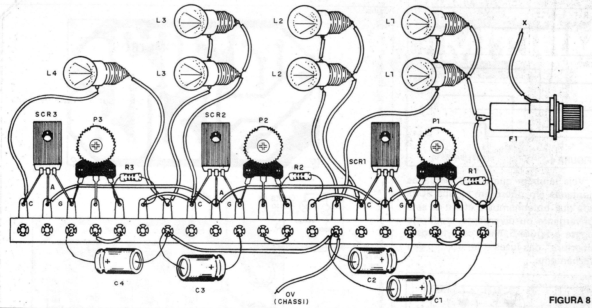 Obtemos os efeitos desejados utilizando 3 SCRs que são ligados um após outro, tendo na interligação um sistema de retardo formado por um resistor (ajustável) e um capacitor. (figura 3)