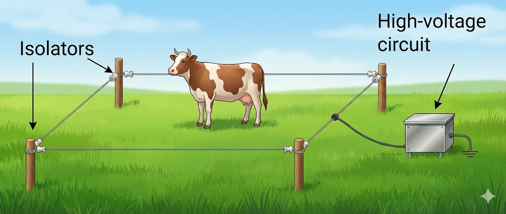 O circuito é alimentado pela rede de energia CA, mas é seguro porque os eletrodos de alta tensão são isolados. Porém, embora não seja perigoso, pode causar choques severos se tocado, por isso o montador deve cuidar de sua instalação, colocando-o onde ninguém tenha acesso aos eletrodos. O circuito também pode ser utilizado como cerca elétrica, mantendo os animais confinados, conforme sugere a Figura 3.15.1. O fio descoberto deve ser isolado nesta aplicação.
