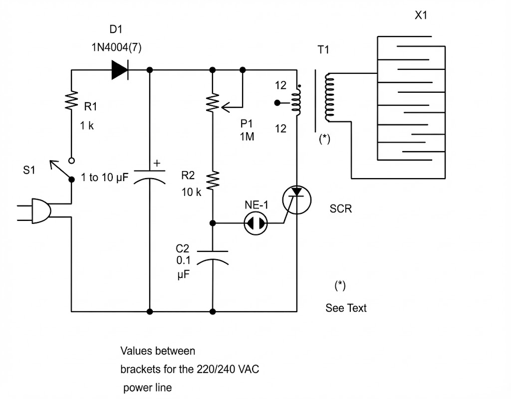 Para operar a partir da linha de alimentação 220/240 VAC, altere R1 para 1 kΩ, substitua D1 por um 1N4007 e use o TIC106D para o SCR. Não é necessário montar o SCR em um dissipador de calor, pois ele funciona apenas por curtos intervalos de tempo sem gerar grandes quantidades de calor.