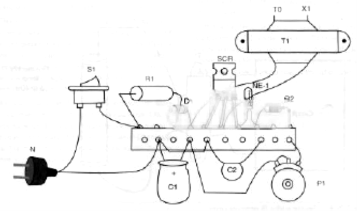 Essa maneira simples de montar é ideal para iniciantes que não têm recursos para fazer uma placa de circuito impresso (PCB). Ao montar, tome cuidado com as posições dos componentes polarizados, como diodos, capacitor e SCR.