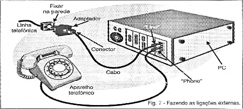 A placa do modem é feita de tal forma que, ao ser encaixada num slot livre, pode ser fixada por meio de um parafuso na caixa da unidade de sistema mantendo-se firme em posição de funcionamento. Esta fixação também torna acessível os terminais de ligação da linha telefônica e de um telefone, veja a figura 3.