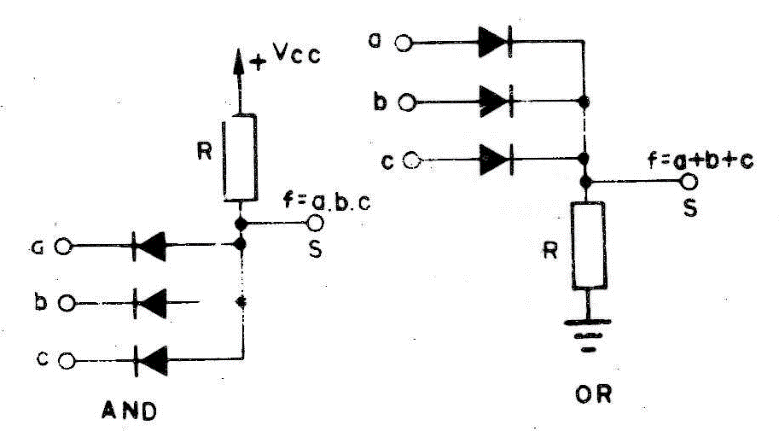 A figura 1 mostra as configurações básicas das portas AND e OR e diodos, ambas com três entradas designadas por a, b e c e uma saída s; esta saída é uma função lógica das entradas.
