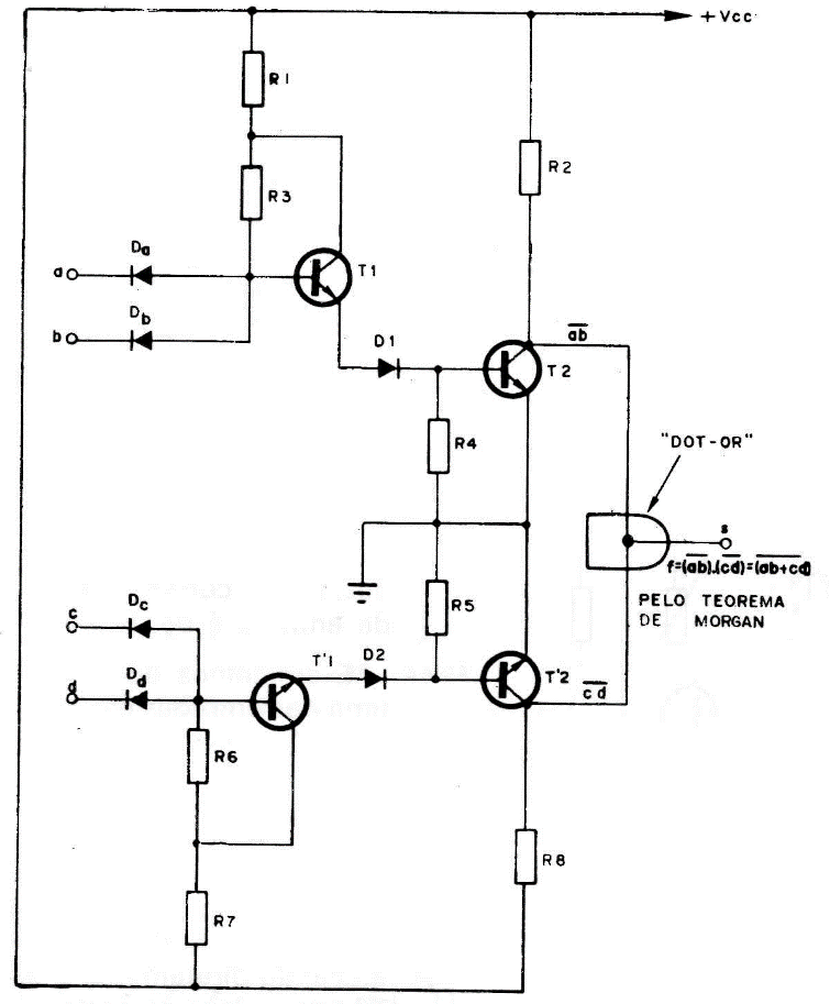 A figura 9 mostra a forma de associar a lógica a diodos, mostrada anteriormente (figura 1), a um elemento ativo inversor. Para estudar o funcionamento e a tabela verdade destes circuitos basta raciocinar da seguinte maneira: quando a tensão na entrada da base do transistor é alta (H), existe uma grande corrente na referida base que satura o transistor, isto faz com que sua saída (em coletor)caia para zero ou próximo de zero (nível L); se a tensão de entrada for zero ou próxima (nível L), a corrente de base será praticamente nula, levando o transistor ao corte e, portanto, a tensão de coletor será, em primeira aproximação Vcc, isto é, alta (nível H).