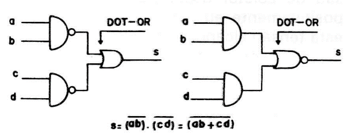A estrutura desta lógica permite a interligação das saídas de diversas portas a fim de realizar o que se conhece por 'função gratuita" ou cablado (em inglês: "DOT--OR" ou "Wired-OR", ou, ainda, "Implied--AND"); assim, se tomarmos dois NAND e ligarmos suas saídas em curto, tal como é mostrado na figura 16, teremos, com esse ponto de ligação, realizado uma função AND, pois esse ponto só estará no nível lógico H (lógica positiva) se os dois NAND tiverem suas saídas em nível H; um dos NAND tendo sua saída L é suficiente para que o "ponto" caia a L pois seu transistor de saída saturado drena a corrente dos dois resistores, aterrando o referido ponto. O circuito equivalente é mostrado na figura 17 em duas configurações; observar que tanto se pode realizar, neste ponto, a função AND como a OR em virtude do teorema de Morgan.