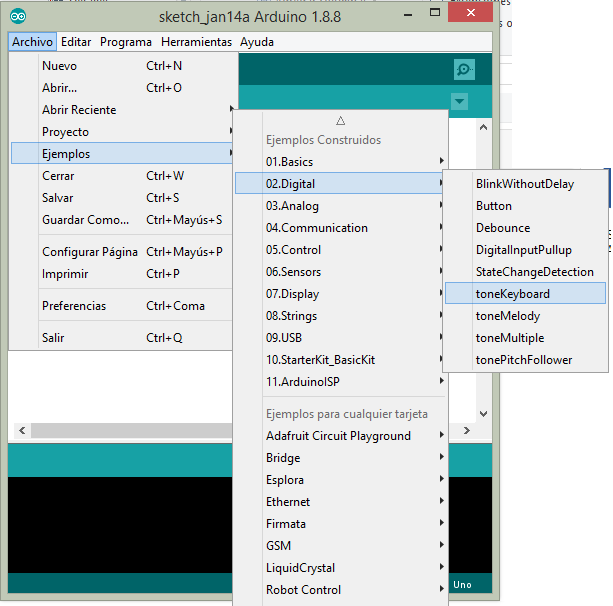 O código de exemplo pode ser encontrado no menu: File-> Examples-> 02.Digital-> toneMelody. O seguinte é o código de exemplo: