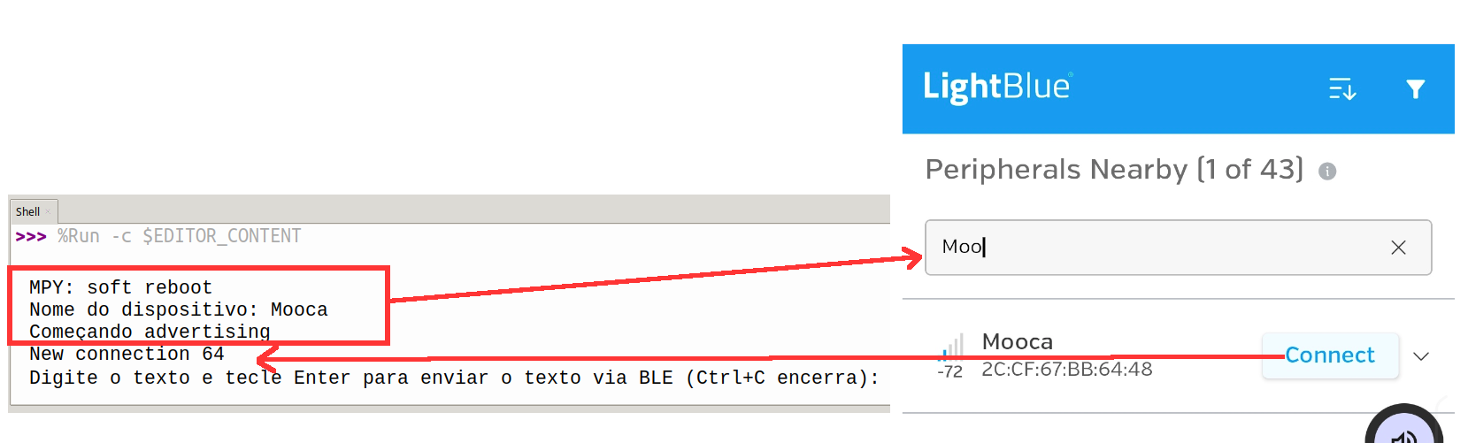 Ao executar o arquivo "ble.py", uma mensagem irá aparecer no Shell do Thonny, onde aparecerá o Nome do dispositivo e o aviso que o "anúncio" do dispositivo está sendo enviado e que está pronto para a conexão. Uma vez conectado, aparecerá no Shell o aviso de uma nova conexão e uma frase pedindo para que você entre com um texto para ser enviado para o aparelho celular (figura 1).