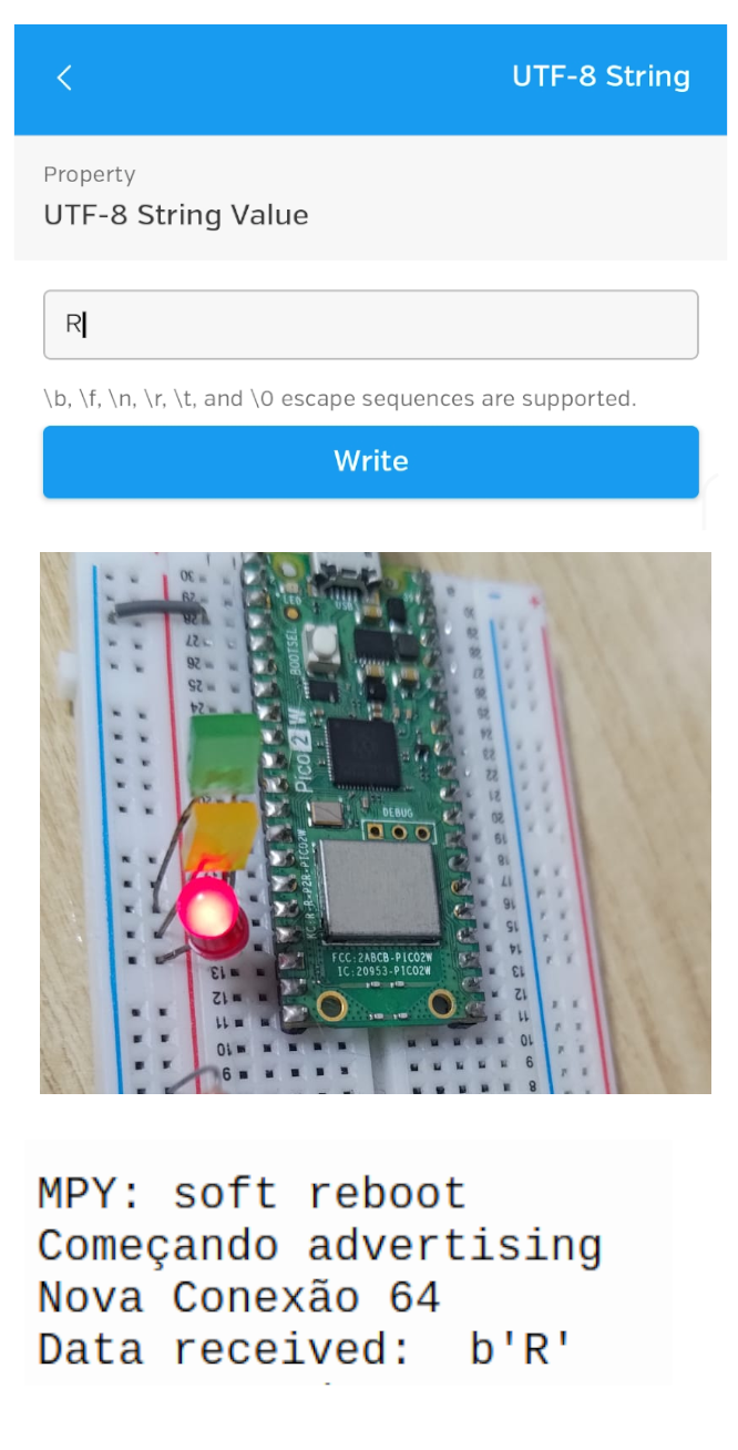 Para enviar os dados, faça como na figura 3, onde digitamos uma frase que será enviada pela Pi Pico 2W para o aparelho celular, mas ele será exibido na tela se pressionarmos o botão "Read".