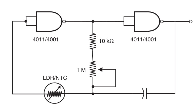 O circuito mostrado pela Figura 1 é outra configuração de um oscilador em que a frequência depende da temperatura ou da quantidade de luz em um sensor. O circuito usa dois portais CMOS NAND (ou NOR). Nesta configuração, mostramos o IC 4001, mas o 4011 também pode ser usado sem problemas. O capacitor determinará a faixa de frequência. O circuito pode acionar muitos dos blocos descritos neste livro e pode ser alimentado por fontes de alimentação de 5 a 15 V.