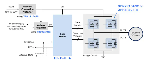 A funcionalidade é otimizada para se concentrar em ligar e desligar o motor, tornando-o compacto. O TB9103FTG é adequado para aplicações de acionamento por motor de trava, incluindo portas deslizantes e portas traseiras. O CI também é ideal para aplicações de acionamento por motor em janelas, espelhos e bancos.