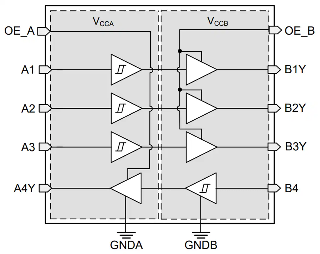 O Tradutor de Nível de Terra Texas Instruments TXG104x de 4 Bits é um tradutor de tensão e nível de terra de direção fixa, não galvânico, que suporta deslocamento de nível lógico entre 1,71 V e 5,5 V e deslocamento de nível de terra de até ±10 V. Comparado aos deslocadores de nível tradicionais, a família TXG104x pode resolver os desafios de tradução de tensão entre diferentes níveis de terra. VCCA é referenciado a GNDA e VCCB é referenciado a GNDB. Os pinos Ax são referenciados ao nível lógico VCCA, enquanto os pinos Bx são referenciados ao nível lógico VCCB. Tanto a porta A quanto a porta B podem aceitar tensões de 1,71 V a 5,5 V. Este dispositivo inclui dois pinos de habilitação que podem colocar as respectivas saídas em um estado de alta impedância quando o pino OE está conectado ao GND ou em estado flutuante. Em caso de perda de energia ou sinal de entrada, a saída é definida como baixa por padrão quando o pino OE está em nível alto. A fuga entre GNDA e GNDB é < 30 nA quando o VCC está em curto com o GND.