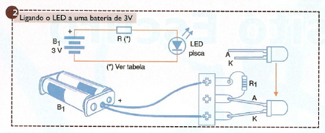 Na figura 2 temos o modo de se fazer a conexão de um LED desse tipo a uma bateria de 3 V (2 pilhas).
