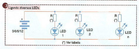 A ligação de diversos LEDs num projeto mecatrônico, por exemplo, luzes piscantes de diversas cores num robô, pode ser feita conforme mostra a figura 3.